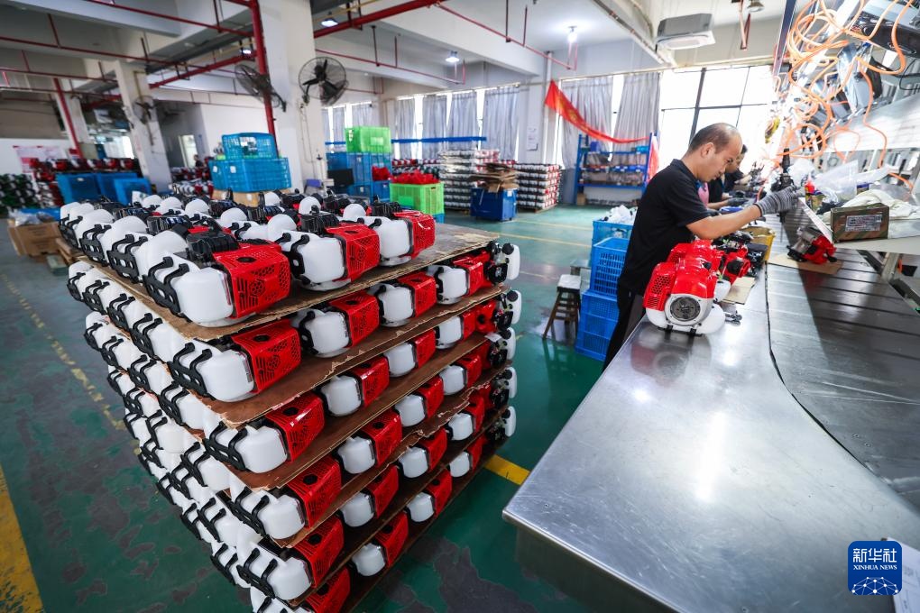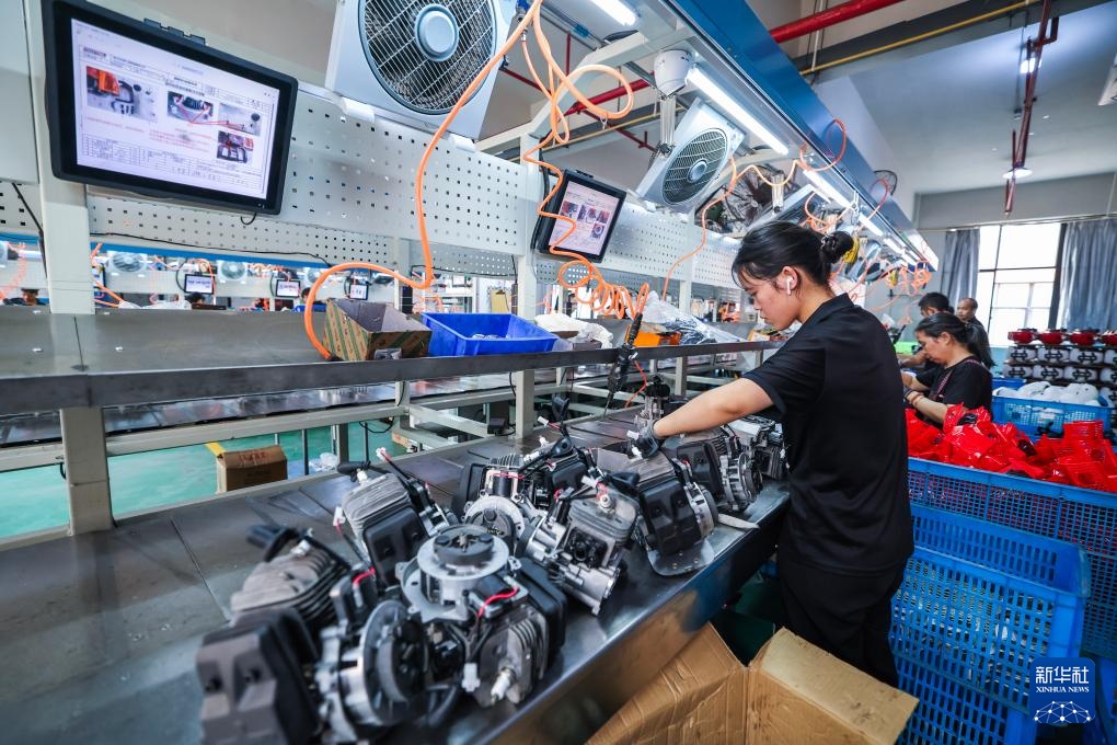 8月14日,在金华市金东区曹宅镇的浙江托马斯工具制造有限公司数字化车间内,工人在流水线上生产出口的园林机械。