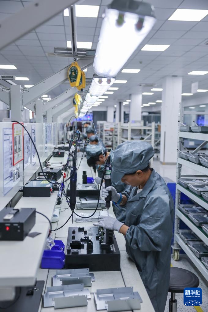 8月14日,在金华市金东区江东镇的浙江创驱智能科技有限公司数字化车间内,工人在自动化流水线上装配电驱设备。
