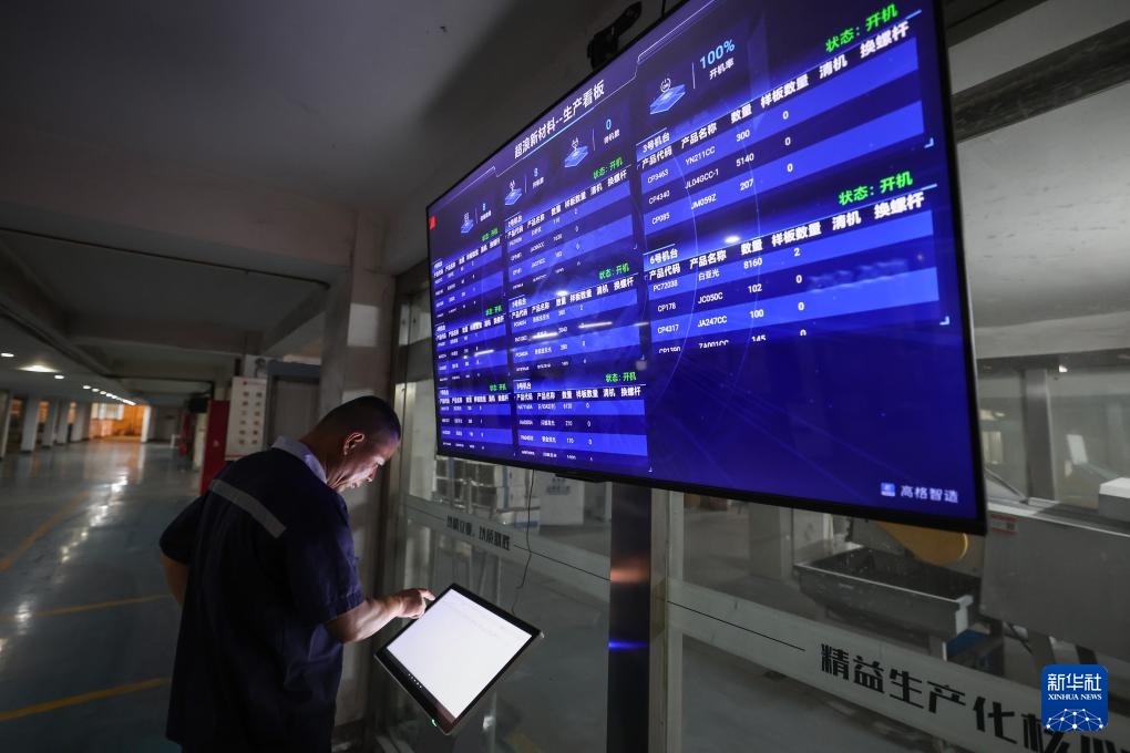 8月14日,在金华市金东区江东镇的浙江超浪新材料有限公司数字化车间内,工作人员在后台查看各条流水线的生产情况。