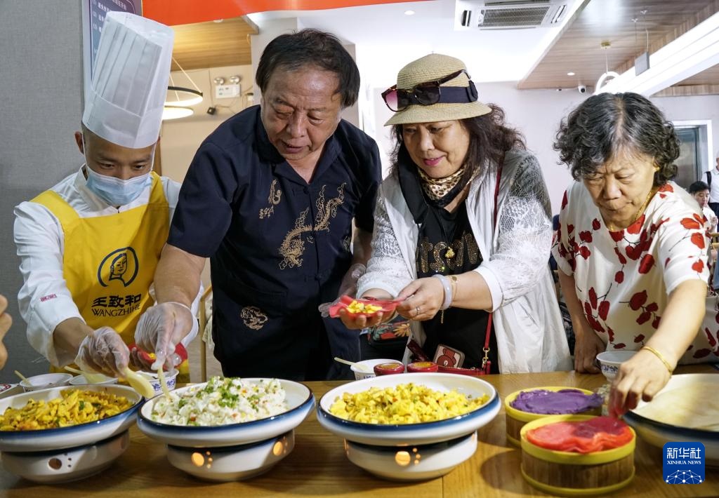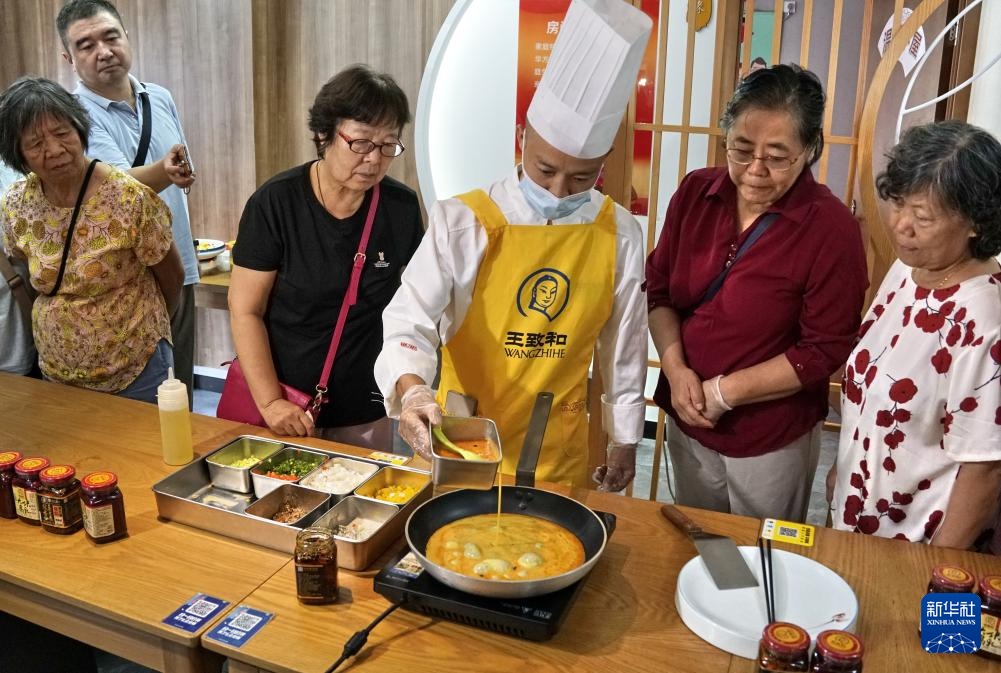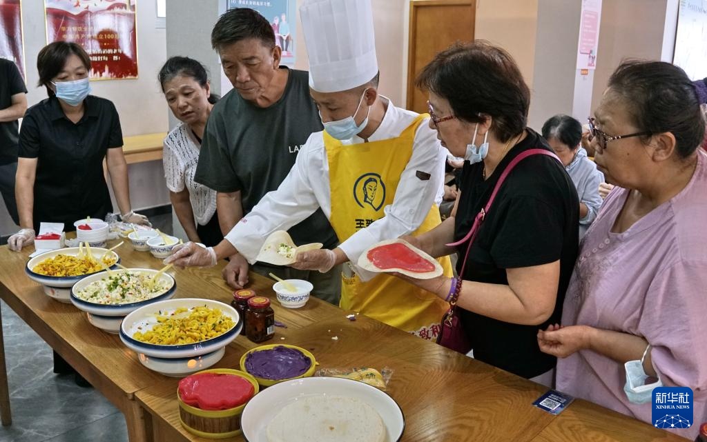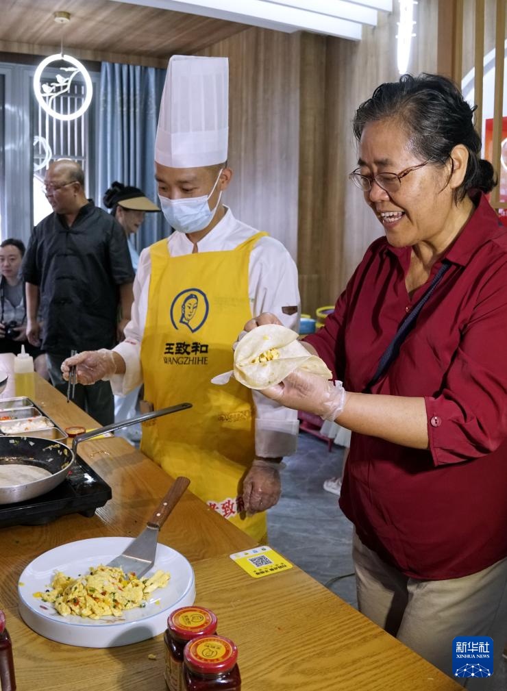 当日是末伏第一天,在北京市西城区白纸坊街道,来自北京老字号王致和等企业的工作人员带领社区居民、环卫工人和社区志愿者等,学习制作、品尝烙饼腐乳摊鸡蛋,迎接凉爽秋天的到来。