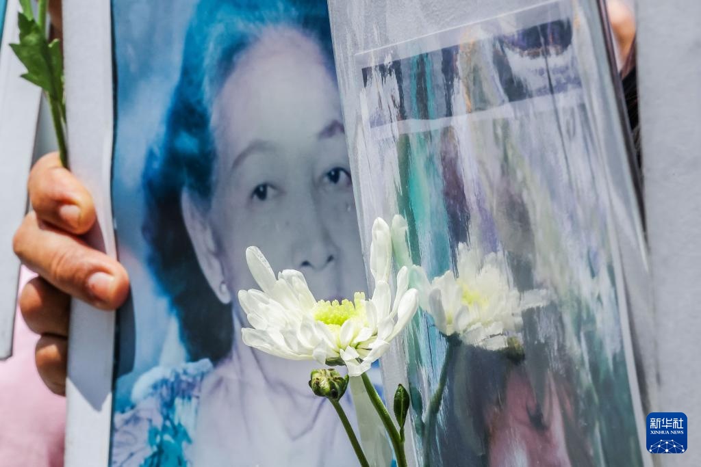 8月14日,在菲律宾马尼拉,参加游行的群众手持鲜花与“慰安妇”受害者的照片。