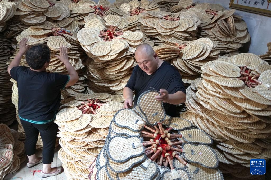 8月14日,山东省新泰市羊流镇的农户在展示刚制作的麦秆扇。