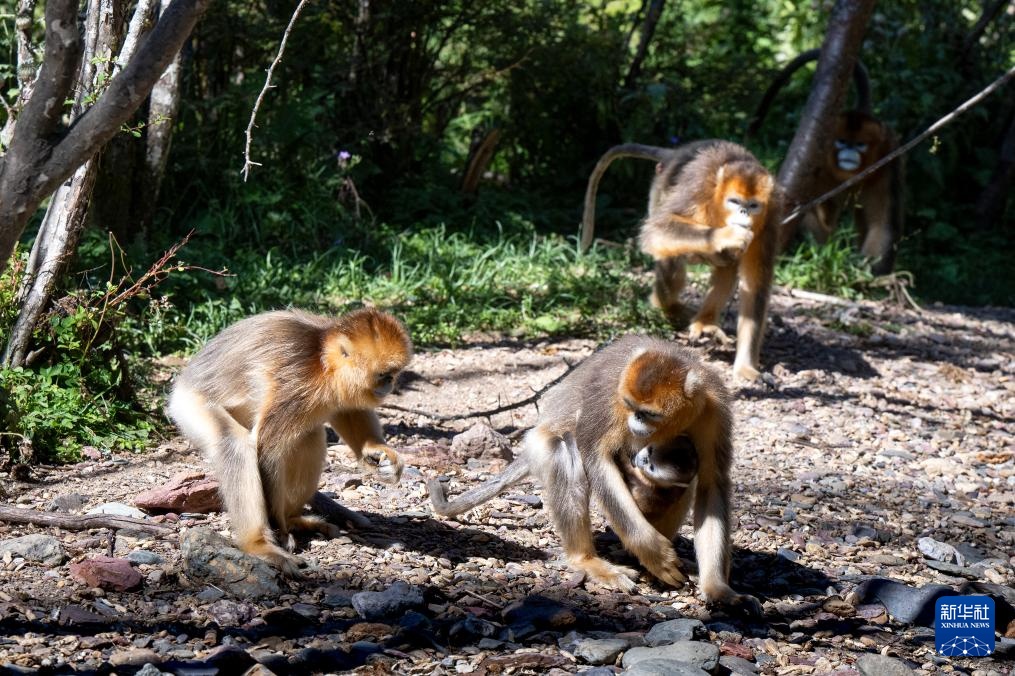 8月15日,金丝猴在神农架国家公园大龙潭金丝猴野外研究基地山林中活动。