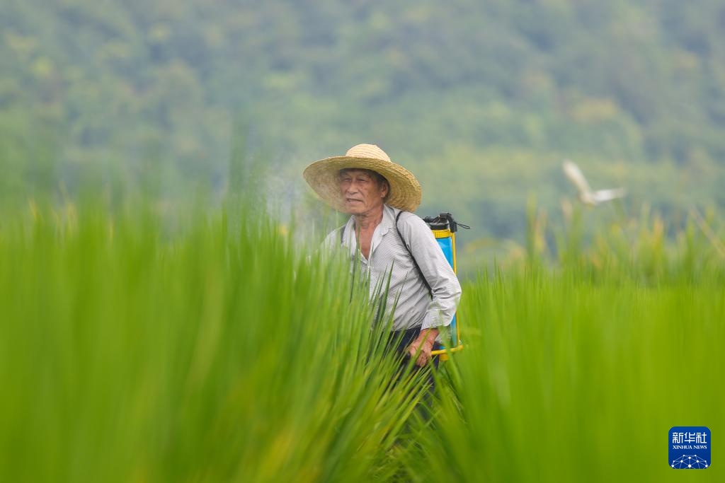 8月14日,诸暨市赵家镇花明泉村村民何新云在稻田内喷洒农药。