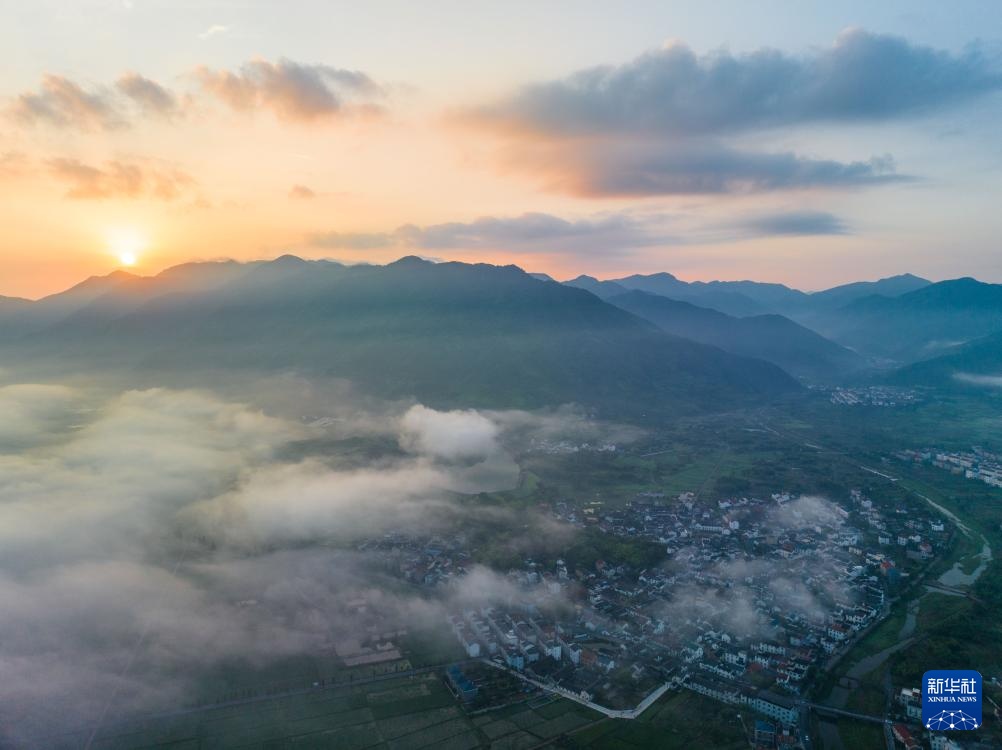 这是晨曦中的诸暨市赵家镇花明泉村(无人机照片,8月15日摄)。