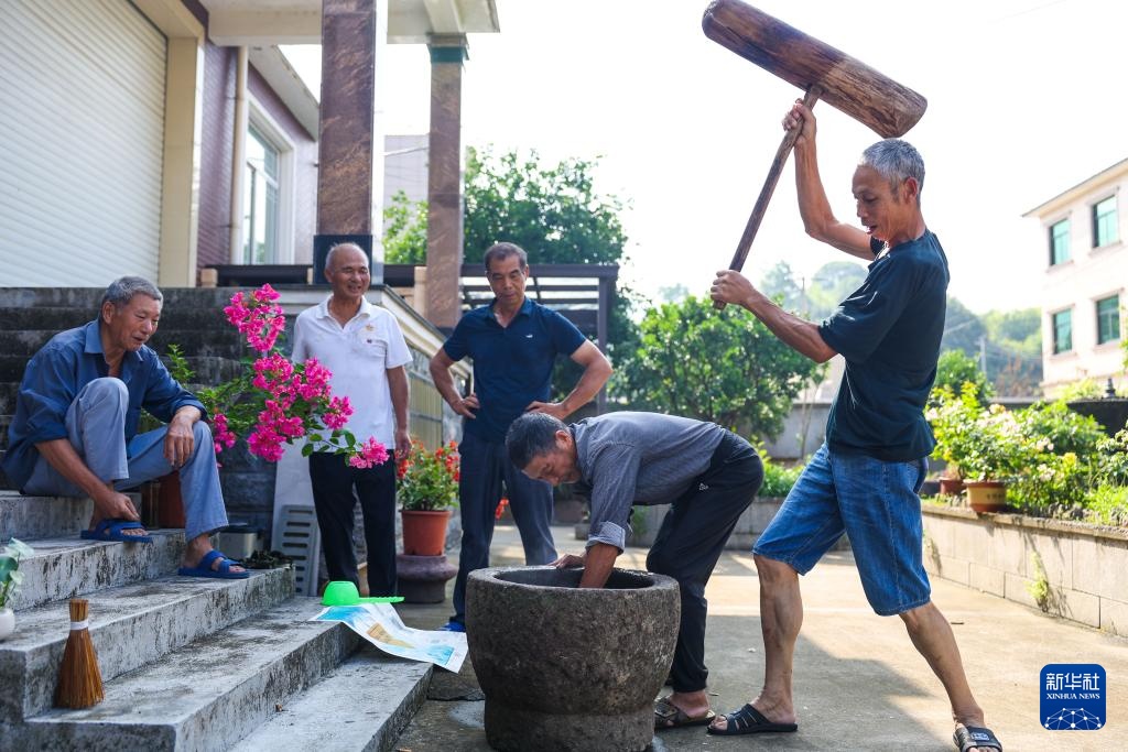 8月15日,诸暨市赵家镇花明泉村村民们一起制作当地特色食物青饺。