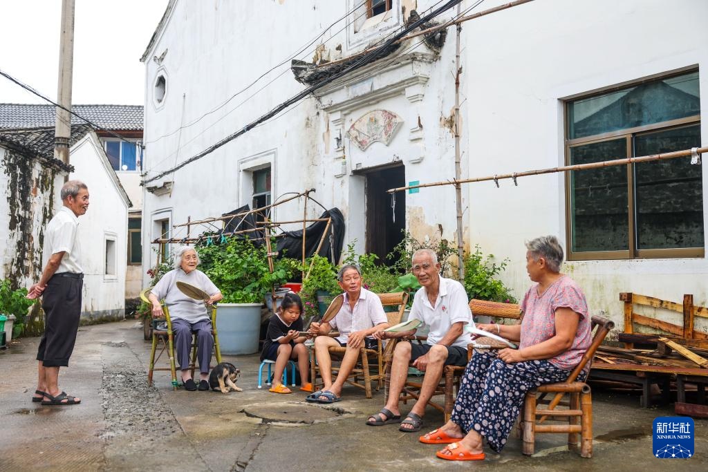 8月14日,诸暨市赵家镇花明泉村村民在村内乘凉聊天。