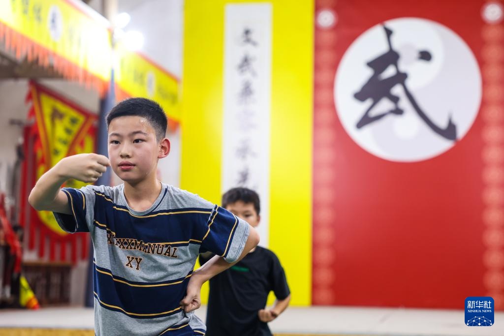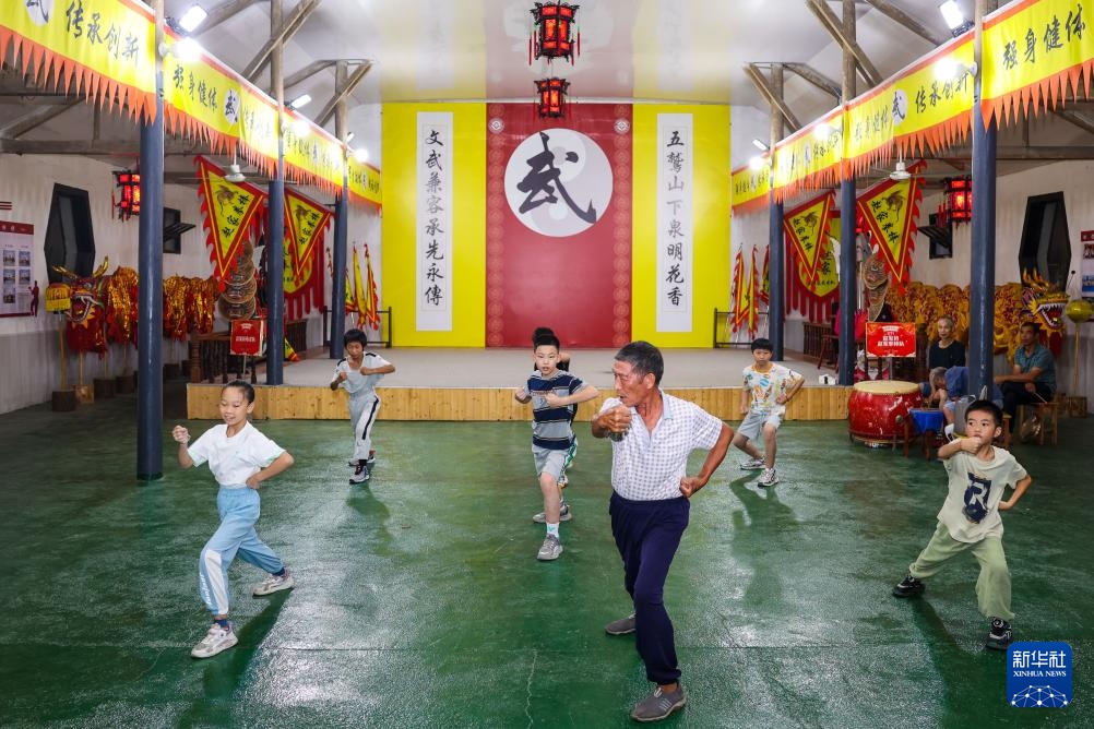 8月14日夜,诸暨市赵家镇花明泉村的少年们在师傅何新云(前中)的带领下练习赵家拳棒。