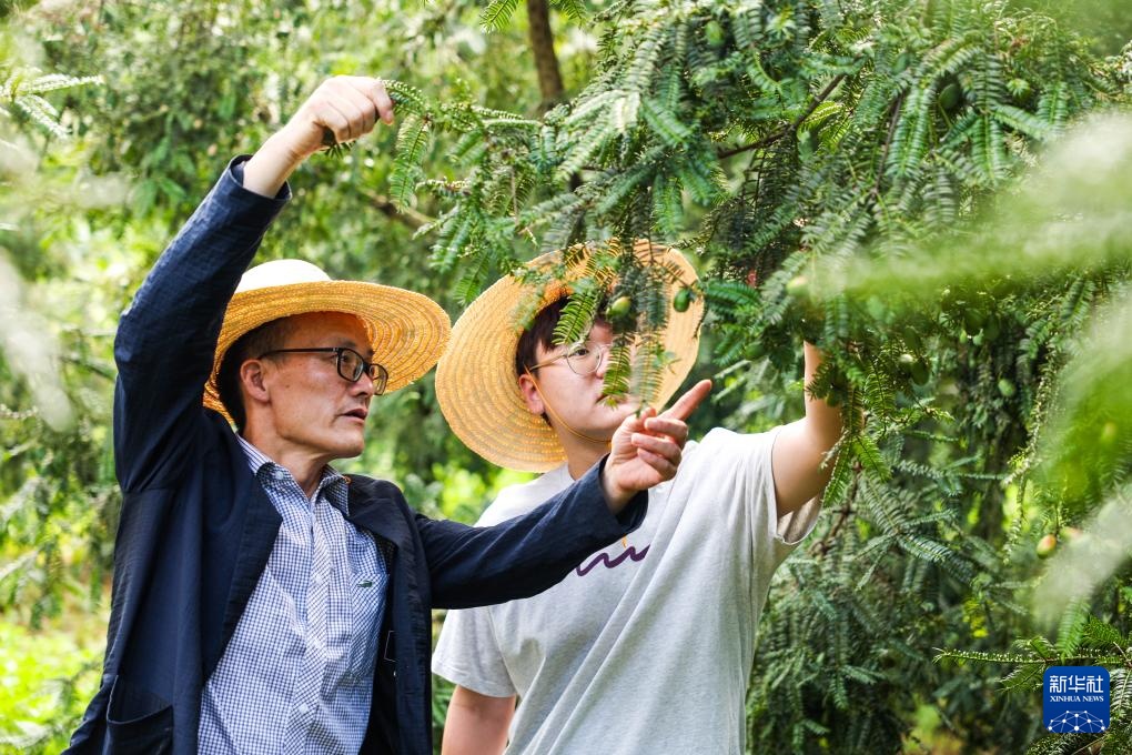8月15日,诸暨市赵家镇花明泉村村民何伟录(左)与儿子何铁建查看自家香榧树果实的生长情况。