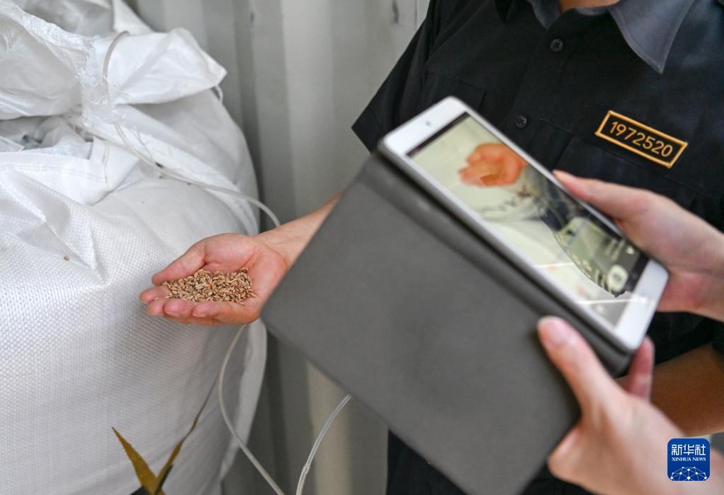 8月15日,在绥芬河铁路口岸集装箱换装场,绥芬河海关铁路查验一科关员对进境中欧班列货物进行查验。