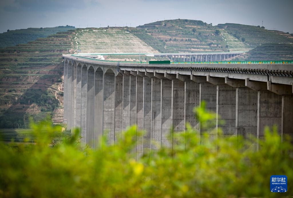 8月16日,车辆行驶在银昆高速杜家沟大桥上,远处是宁夏固原市彭阳县县城(无人机照片)。