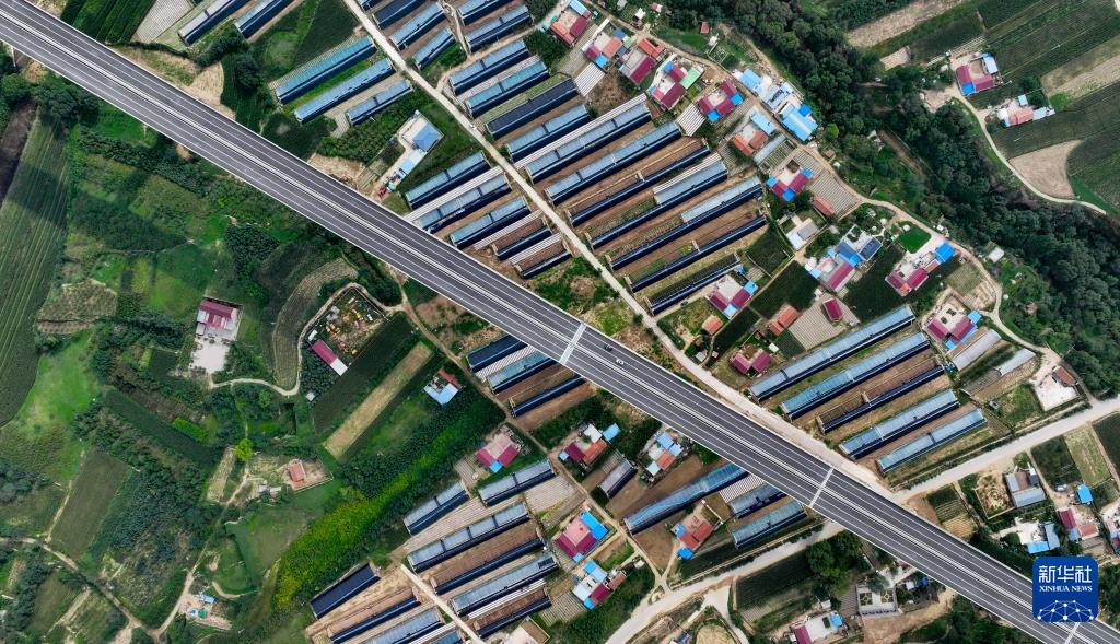 8月16日,车辆从宁夏固原市彭阳县彭阳北收费站驶入银昆高速(无人机照片)。