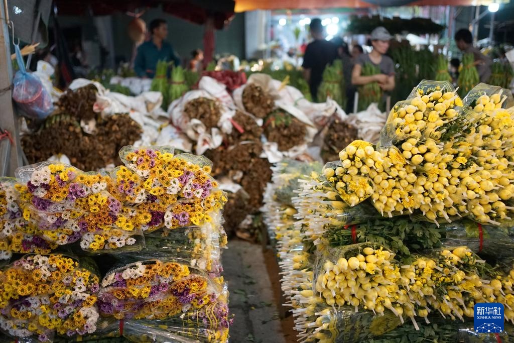 8月15日,在越南河内的鲜花批发市场,花商整理待售的鲜花。