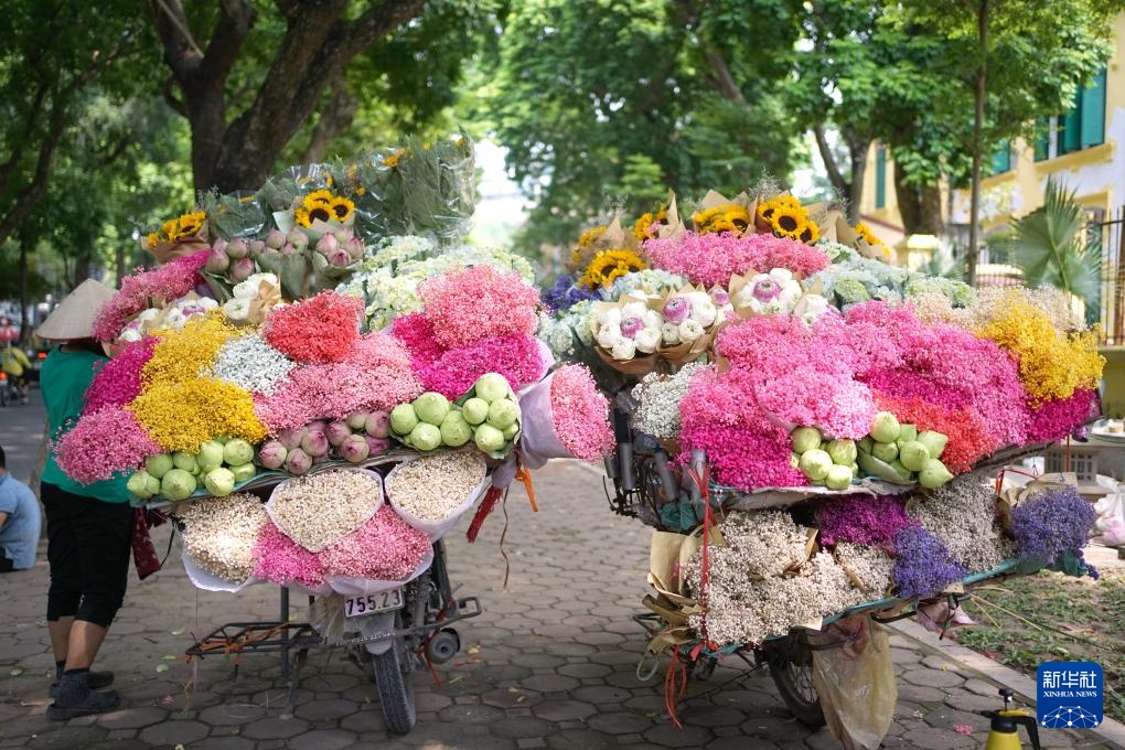 8月16日,越南河内的一条街道上集聚多个鲜花流动摊。