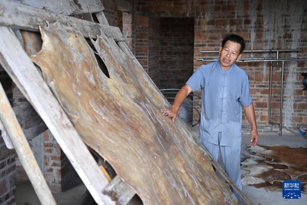 施绍汉在查看晾晒的牛皮,准备制作烟墩大鼓(8月15日摄)。