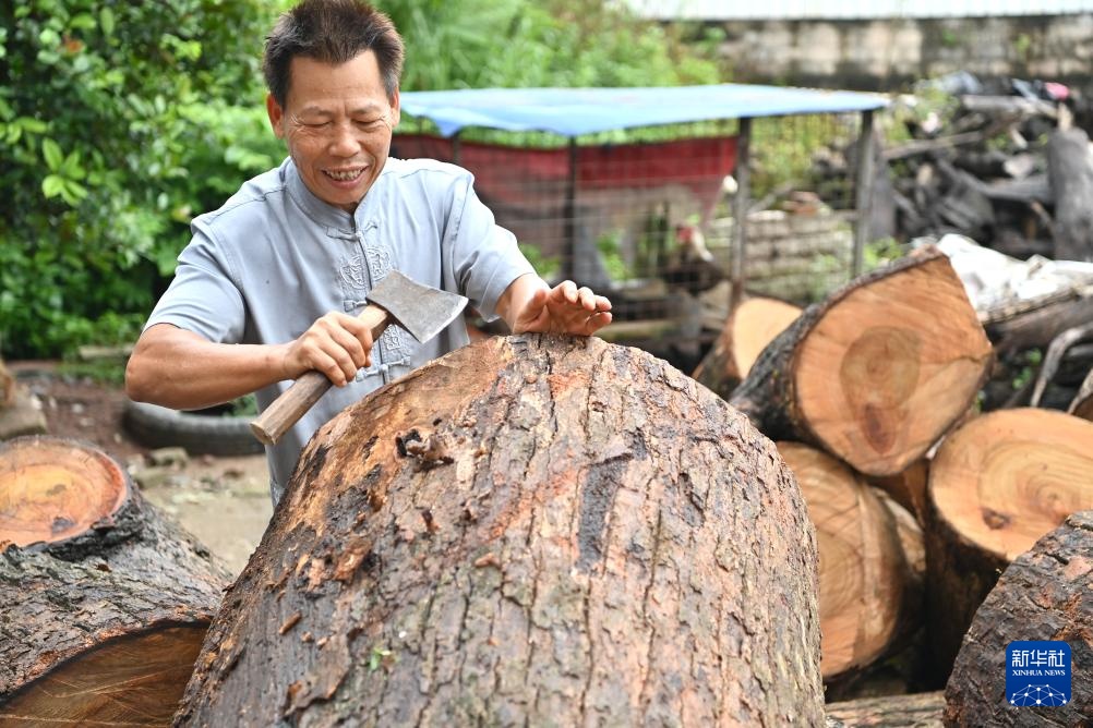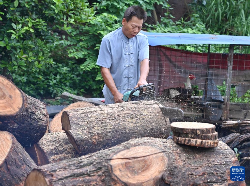 施绍汉在给木头去皮,准备制作烟墩大鼓(8月15日摄)。