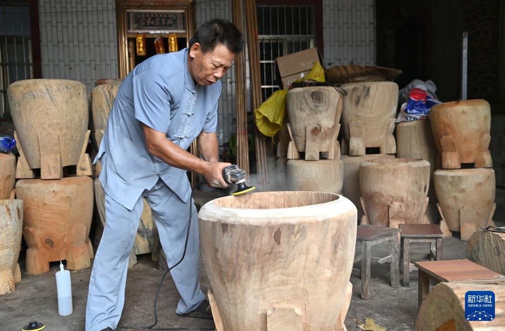 施绍汉在打磨木头,制作烟墩大鼓(8月15日摄)。