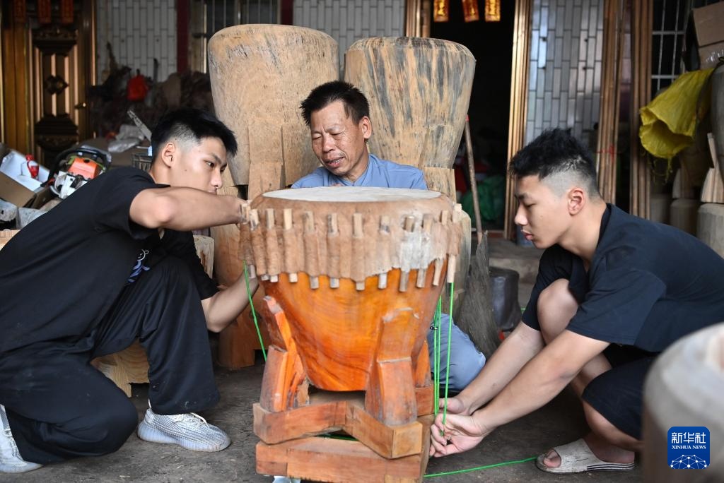 施绍汉指导孙子给烟墩大鼓绑钢丝绳,完成烟墩大鼓制作(8月15日摄)。