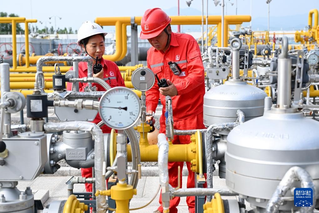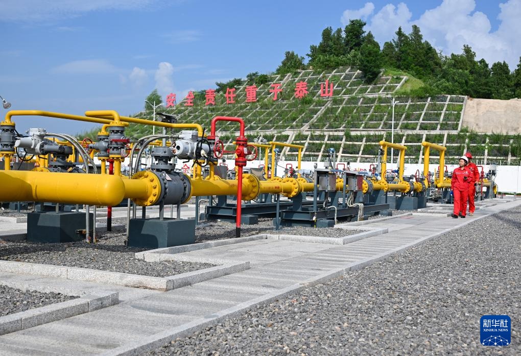 工作人员在章丘东分输站对站内运行中的天然气管道设备进行安检巡视(8月13日摄)。鲁信集团旗下鲁信实业参股建设的天然气章丘东分输站由调控中心对管网生产动态全面感知、集中监视,工艺操作中心智能控制,为管网安全平稳高效运行和民生供暖用气提供了有力保障。