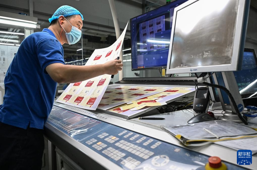 在位于济南市的山东鲁信天一印务有限公司印刷生产车间内,工作人员在审核印刷版样(8月14日摄)。该印务公司依托鲁信集团金融支持,大力投入印刷包装制造全流程智慧化建设,通过提升设备自动化水平提效降损,推广节能低碳生产技术装备,推进工艺流程更新升级,带动传统产业向数字化、智能化、绿色化转型升级。