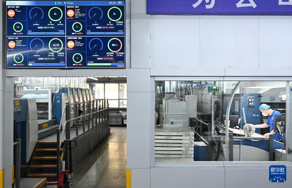 在位于济南市的山东鲁信天一印务有限公司印刷生产车间内,生产进度即时在显示屏上反馈显示(8月14日摄)。该印务公司依托鲁信集团金融支持,大力投入印刷包装制造全流程智慧化建设,通过提升设备自动化水平提效降损,推广节能低碳生产技术装备,推进工艺流程更新升级,带动传统产业向数字化、智能化、绿色化转型升级。