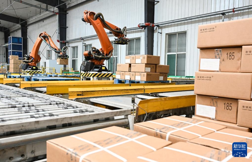 在位于济南市的山东鲁信天一印务有限公司包装车间内,机器人将打包好的产品自动码垛入库(8月14日摄)。该印务公司依托鲁信集团金融支持,大力投入印刷包装制造全流程智慧化建设,通过提升设备自动化水平提效降损,推广节能低碳生产技术装备,推进工艺流程更新升级,带动传统产业向数字化、智能化、绿色化转型升级。