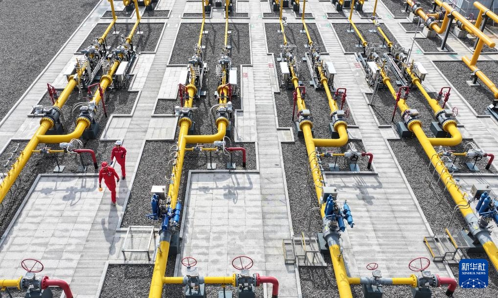 工作人员在章丘东分输站对站内运行中的天然气管道设备进行安检巡视(8月13日摄,无人机照片)。鲁信集团旗下鲁信实业参股建设的天然气章丘东分输站由调控中心对管网生产动态全面感知、集中监视,工艺操作中心智能控制,为管网安全平稳高效运行和民生供暖用气提供了有力保障。