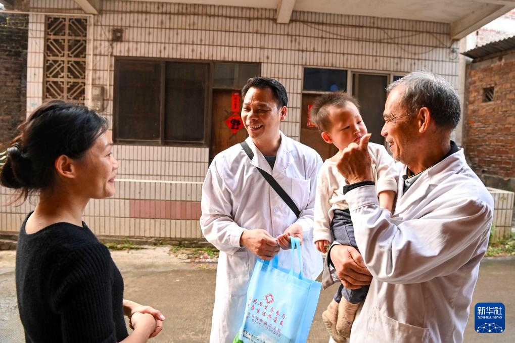 在广西兴业县石南镇环江村,乡村医生梁柱明(右一)和梁德和(右三)与村民交流(2024年2月20日摄)。