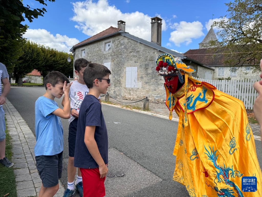 8月10日,来自中国湖南省韶山市的艺术家李雄(右)在法国科龙贝双教堂村的乡村艺术节上表演变脸(手机照片)。