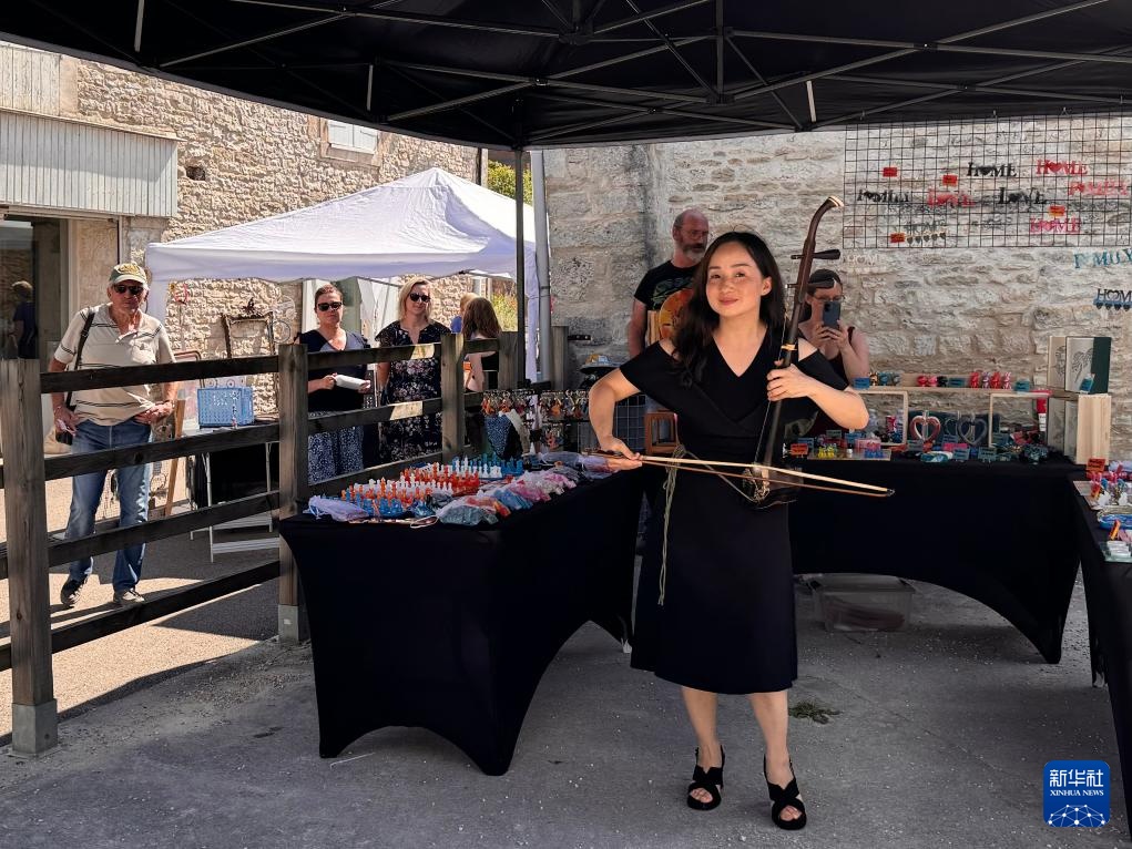 8月10日,来自中国湖南省韶山市的艺术家鄢吉平(前)在法国科龙贝双教堂村的乡村艺术节上演奏二胡(手机照片)。