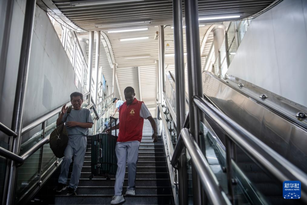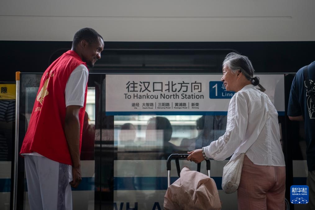 8月18日,阿布(右)在地铁站向乘客提供帮助。