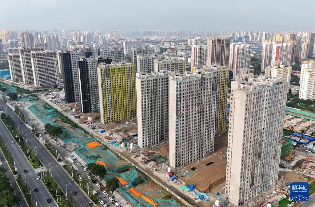 8月19日,中铁二十局的工人在河北省保定市城中村改造三期工程南刘各庄村安置区项目建设工地施工(无人机照片)。
