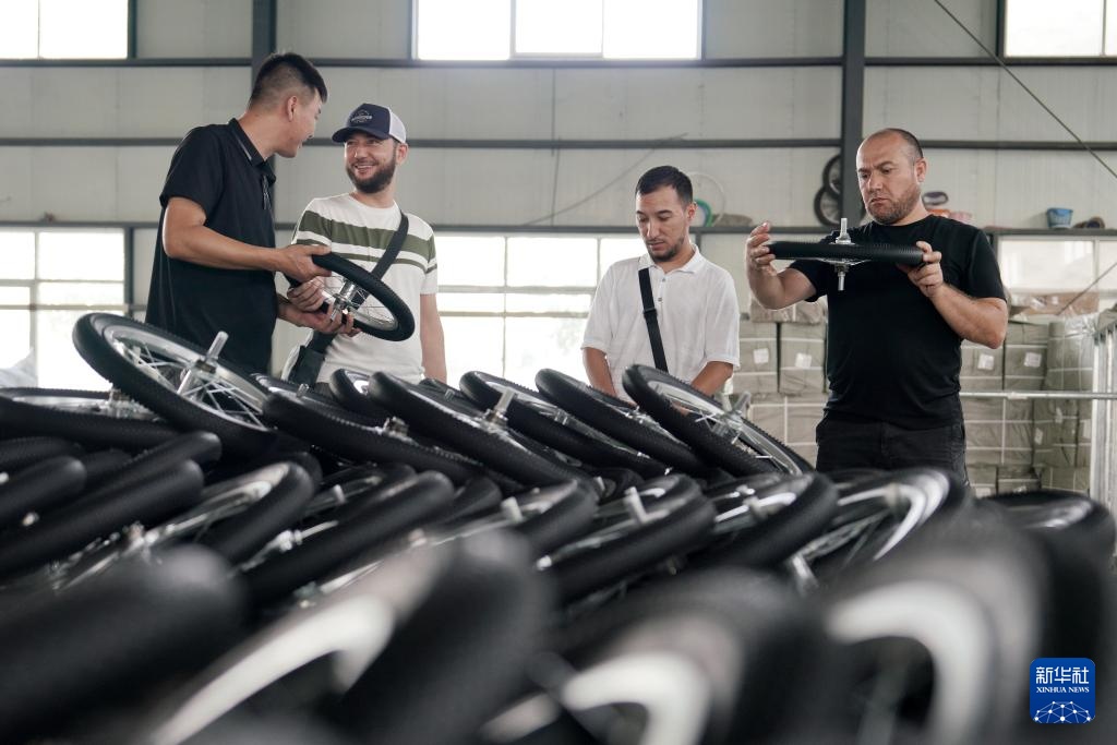 8月19日,来自乌兹别克斯坦的客商在河北省平乡县一家童车生产企业内选购配件。