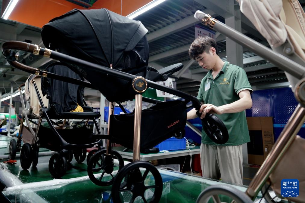 8月19日,河北省平乡县一家童车生产企业的员工在车间内组装儿童推车。