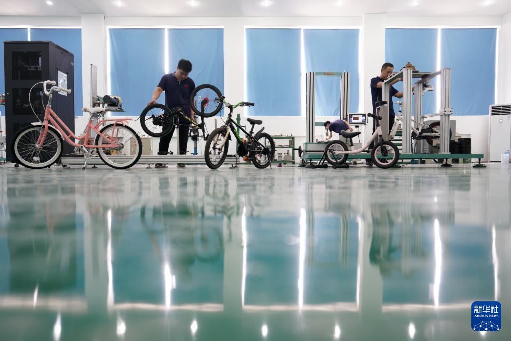 8月19日,河北省平乡县一家童车生产企业的员工在质检车间内检测童车产品质量。
