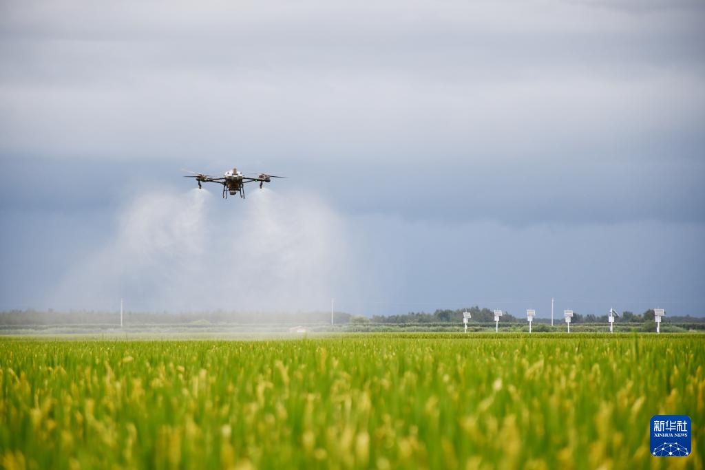 8月16日,在北大荒集团黑龙江八五六农场有限公司第六管理区水稻地块,一架无人机在进行“一喷多促”作业。
