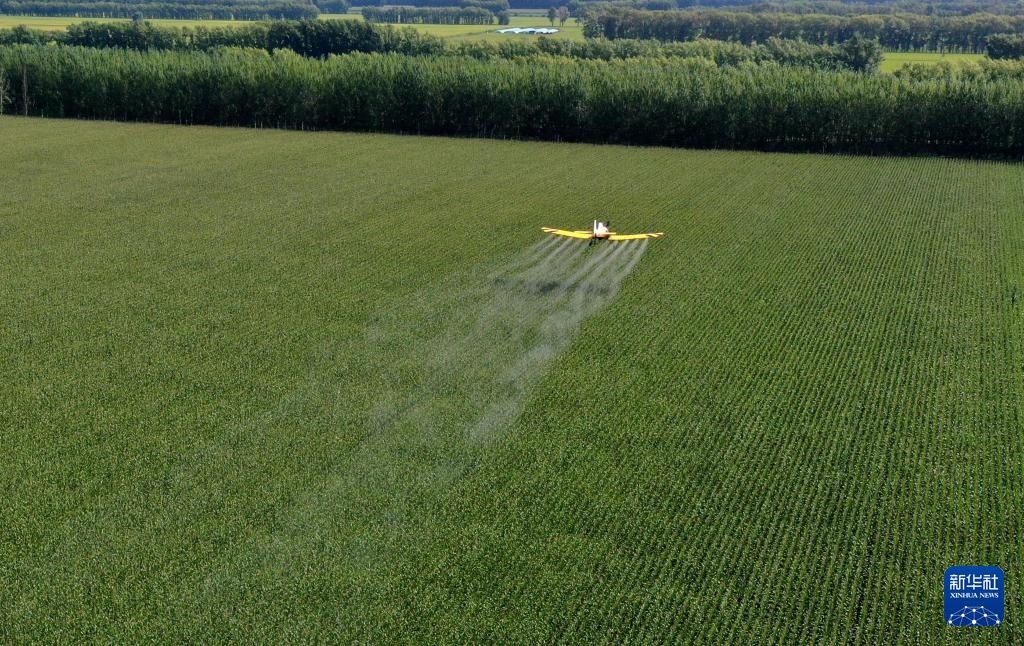 8月20日,在黑龙江北大荒农业股份有限公司友谊分公司第二管区玉米地块,农用飞机进行“一喷多促”作业(无人机照片)。
