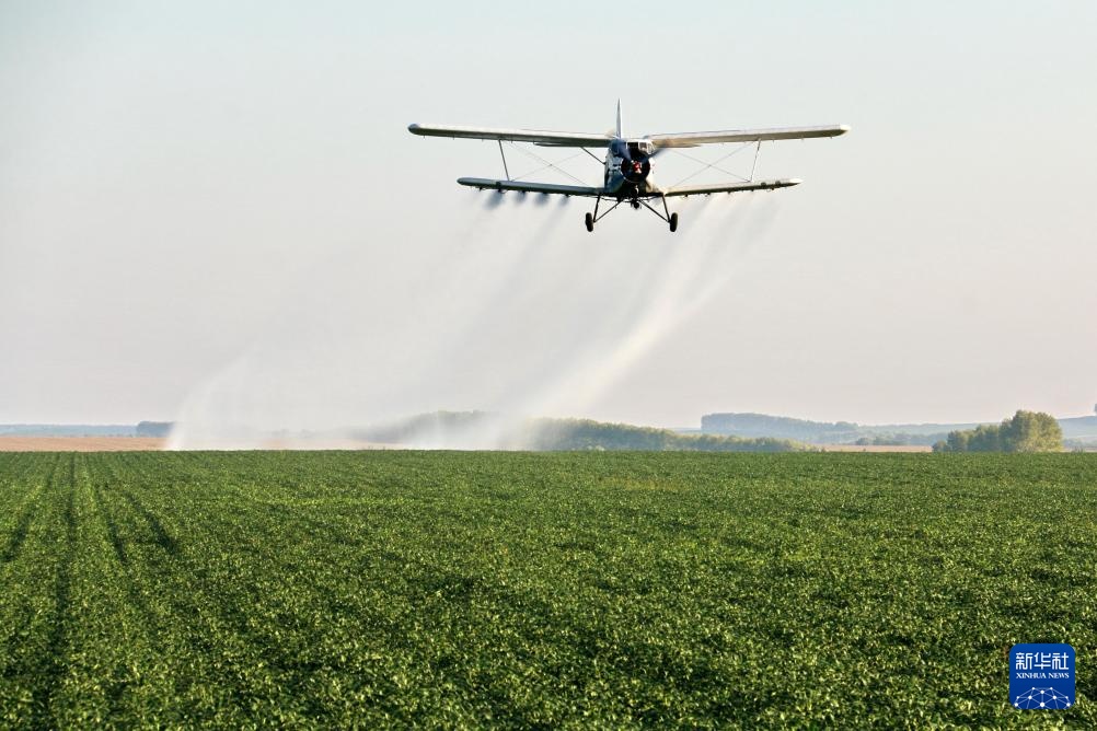 8月20日,在北大荒集团黑龙江五大连池农场有限公司大豆地块,农用飞机在进行“一喷多促”作业。
