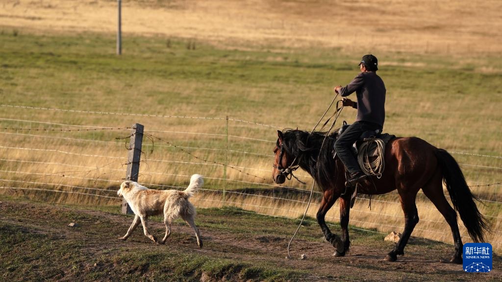 8月20日,在新疆生产建设兵团第九师165团的巴依木扎景区牧场,牧民和牧羊犬一同前行。