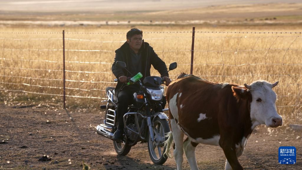 8月20日,在新疆生产建设兵团第九师165团的巴依木扎景区牧场,牧民驾驶摩托车驱赶牛。