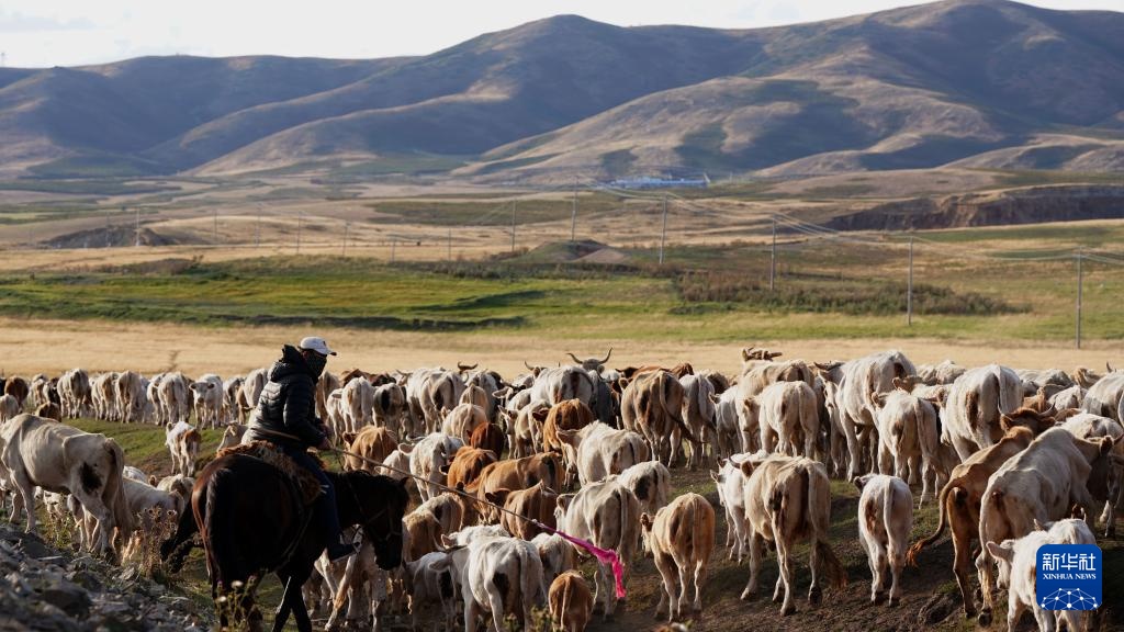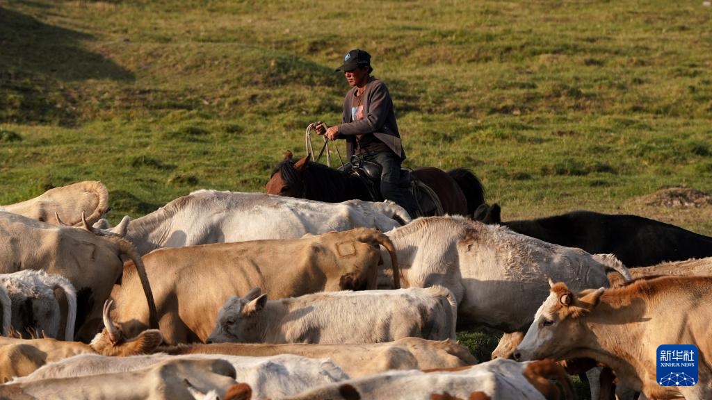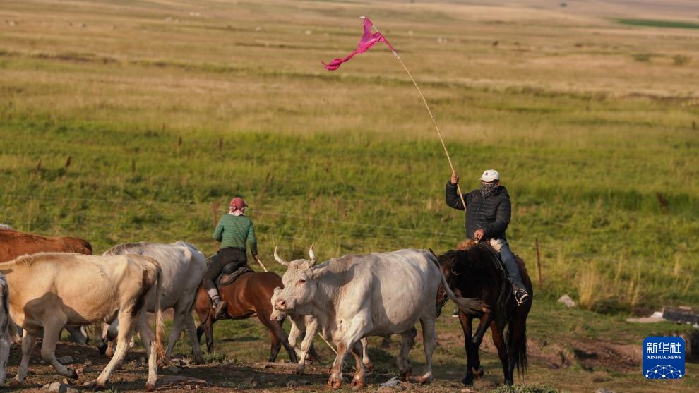 8月20日,在新疆生产建设兵团第九师165团的巴依木扎景区牧场,牧民驱赶牛群。