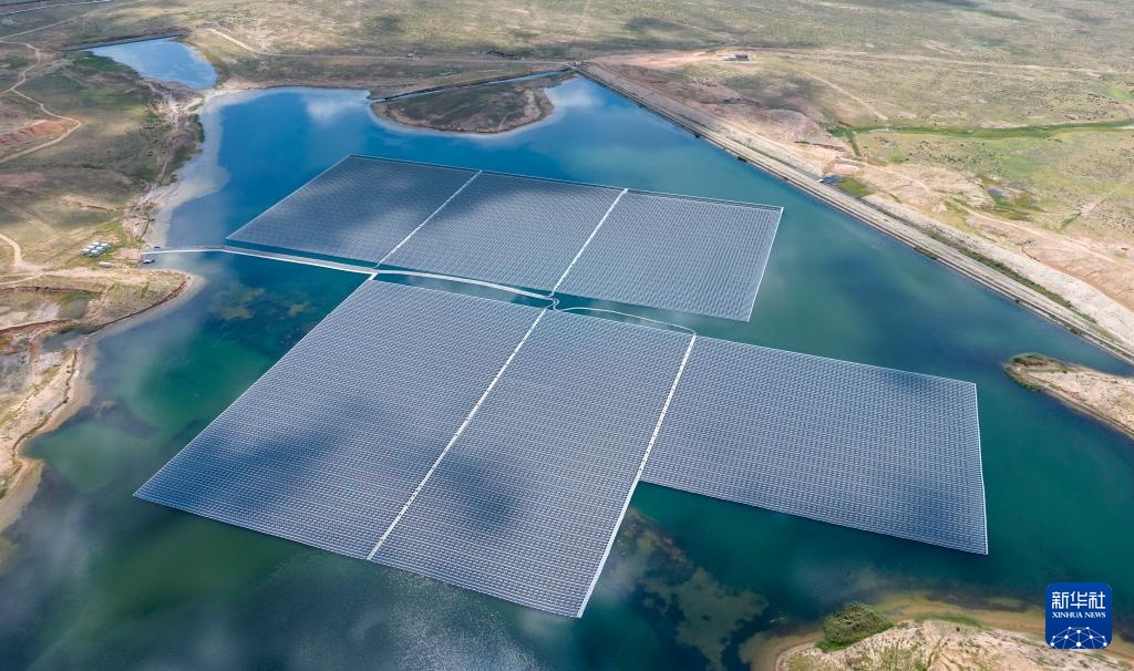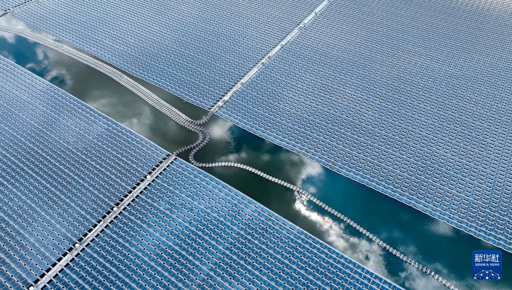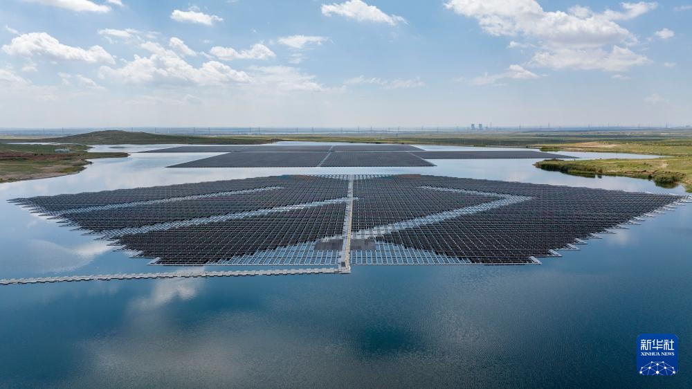 这是8月20日拍摄的位于宁夏灵武市马家滩镇的国家能源集团宁夏电力公司宁东电厂漂浮分布式光伏发电项目(无人机照片)。
