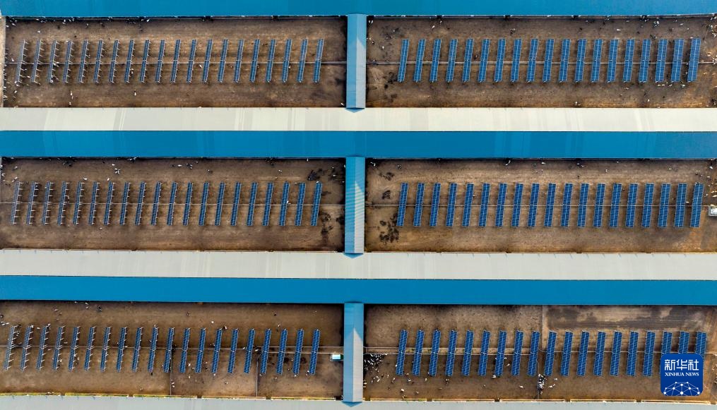 这是8月20日在宁夏灵武市白土岗高标准奶牛养殖基地的一家牧场内拍摄的“牧光互补”项目光伏发电站(无人机照片)。