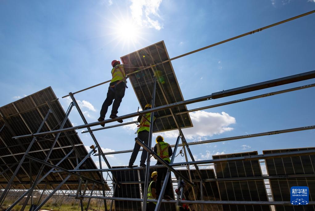 8月20日,在位于宁夏灵武市马家滩镇的TCL中环绿电园区内,工作人员在搭设光伏板。