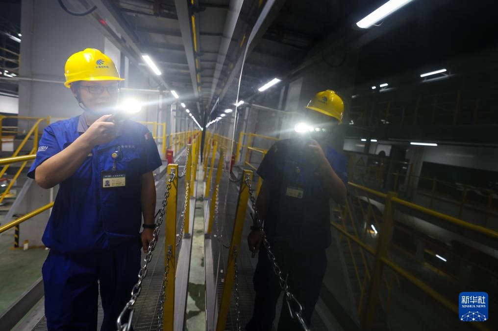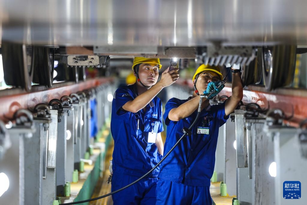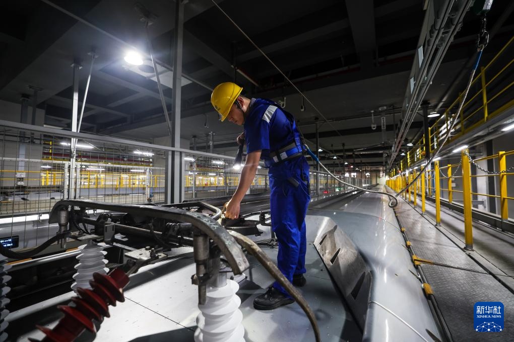 8月21日,杭州西动车运用所的铁路机械师对杭温高铁试运行列车进行检修作业。
