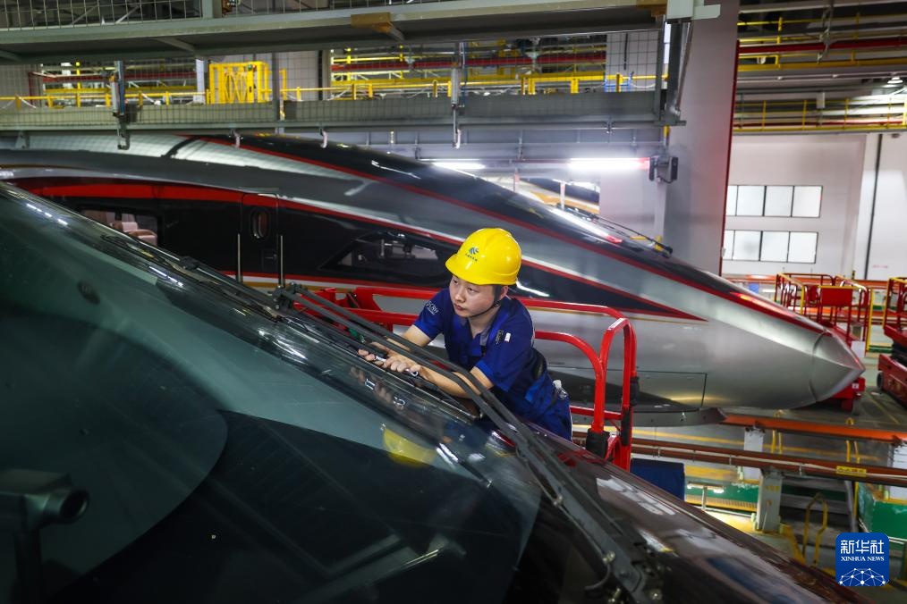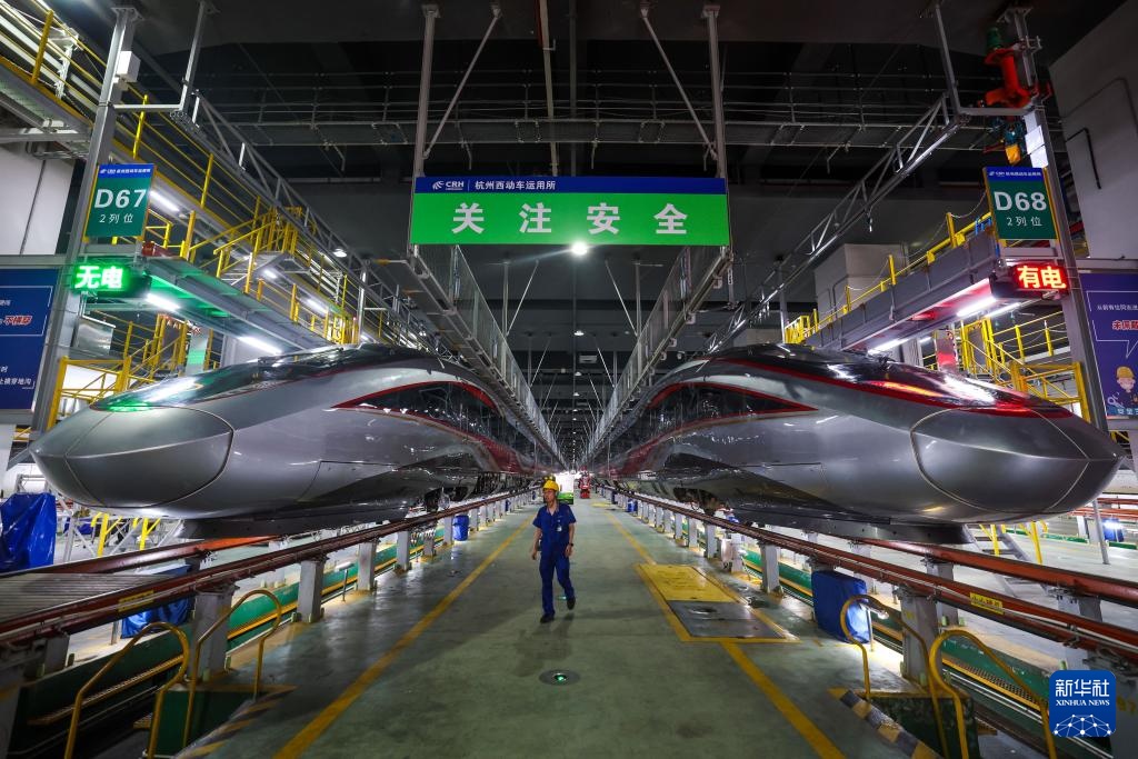 8月21日,杭温高铁试运行列车停在杭州西动车运用所内进行检修作业。
