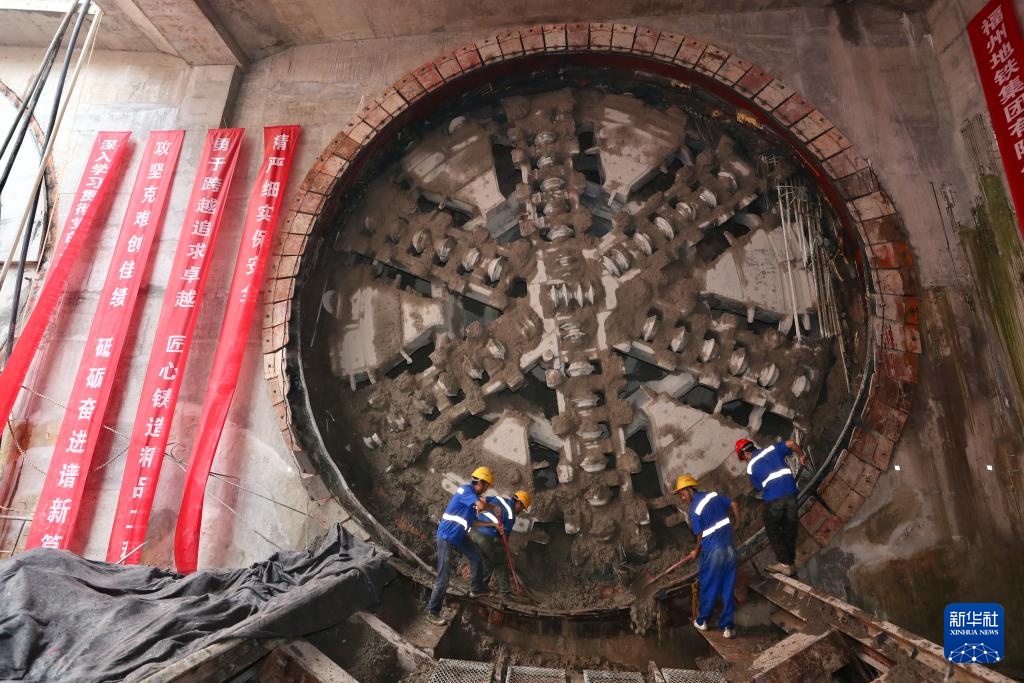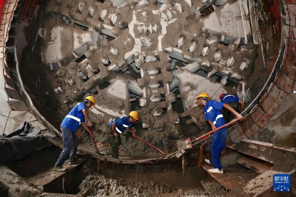 8月21日,中铁上海局城建分公司工人在清理福州滨海快线福州火车站至东门站区间右线盾构机刀盘。
