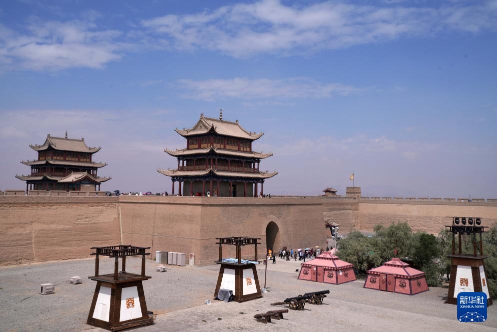 7月14日拍摄的嘉峪关关城柔远门门楼和其后面的嘉峪关楼。