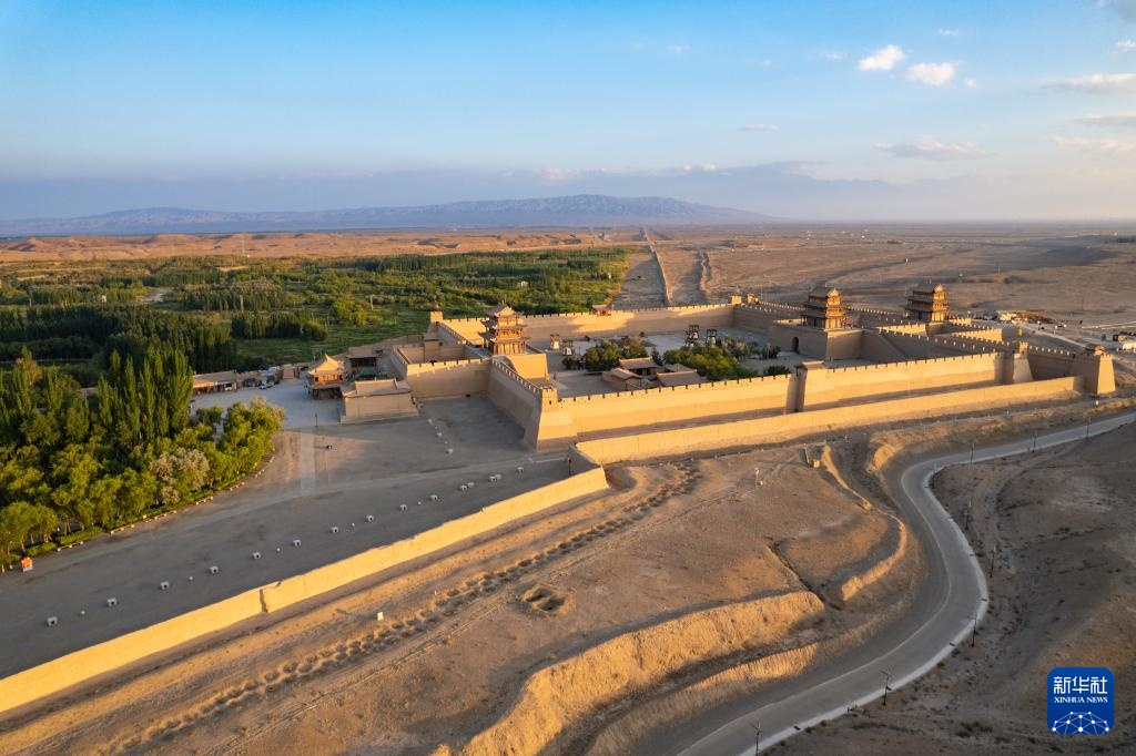 8月15日拍摄的夕阳下的嘉峪关关城(无人机照片)。