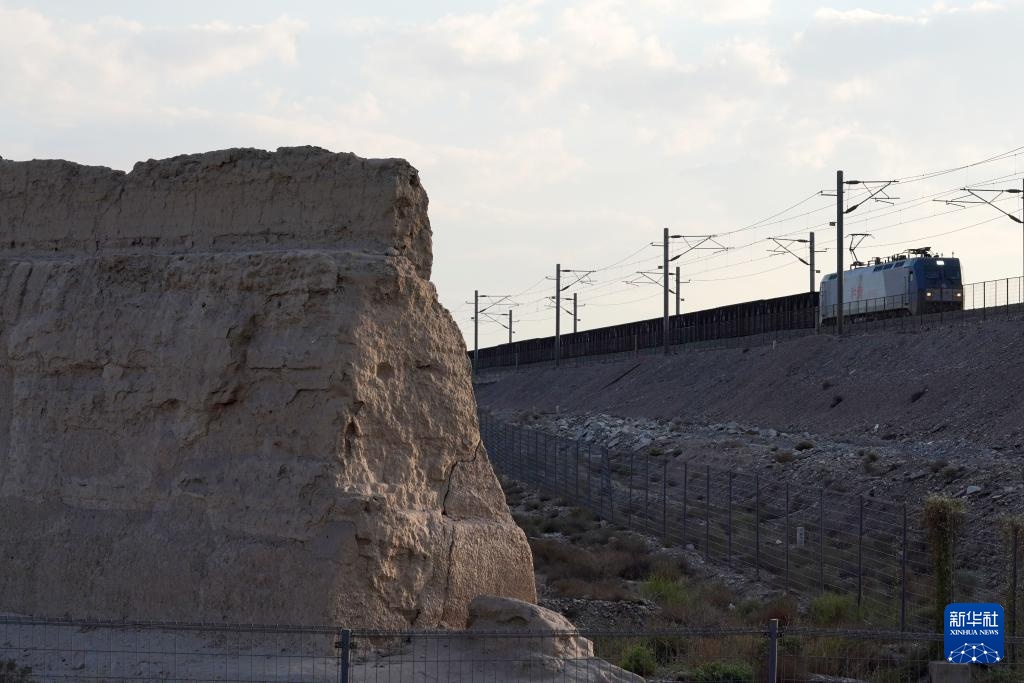 7月14日,在嘉峪关关城南侧,一列火车从明长城旁驶过。